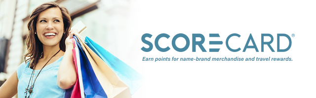 Our credit cards also come with rewards.  ScoreCard® Rewards provide you points that are redeemable for merchandise, airline tickets, hotels, activities, gift cards and much more.  ScoreCard® Rewards now gives you more bonus points – 2X, 3X, 4X or more with ScoreMore!  ScoreMore allows you to earn additional bonus points at participating retails online and in-store.